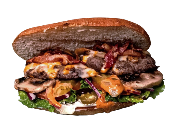 2 Hand Pressed Sirloin Patties served on a Fresh Baked Focaccia Bun Baked Daily with the Works!